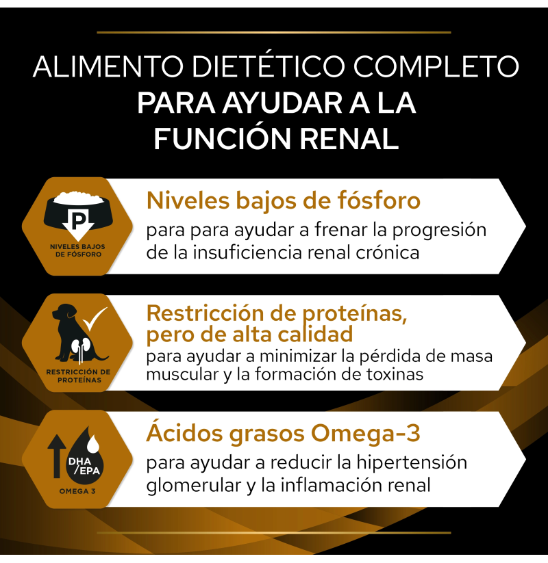 Dieta veterinaria para perros adultos con insuficiencia renal crónica. Bajo en fósforo, con proteínas de alta calidad limitadas y ácidos grasos Omega‑3 para frenar la progresión de la enfermedad renal