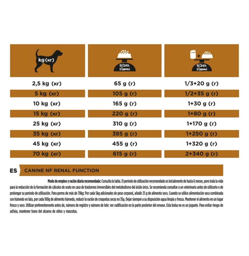Recomendado para perros con enfermedad renal crónica, también útil en situaciones de formación recurrente de cálculos de urato, oxalato y cistina. Puede emplearse de por vida en casos irreversibles o durante 6 meses si se usa para reducir cálculos específicos, siempre bajo supervisión veterinaria. Es fundamental ofrecer siempre agua fresca. La dosis diaria se ajusta al peso del perro (por ejemplo, 165 g al día en un perro de 10 kg), y para perros mayores de 70 kg se añaden 25–30 g por cada 5 kg extra.