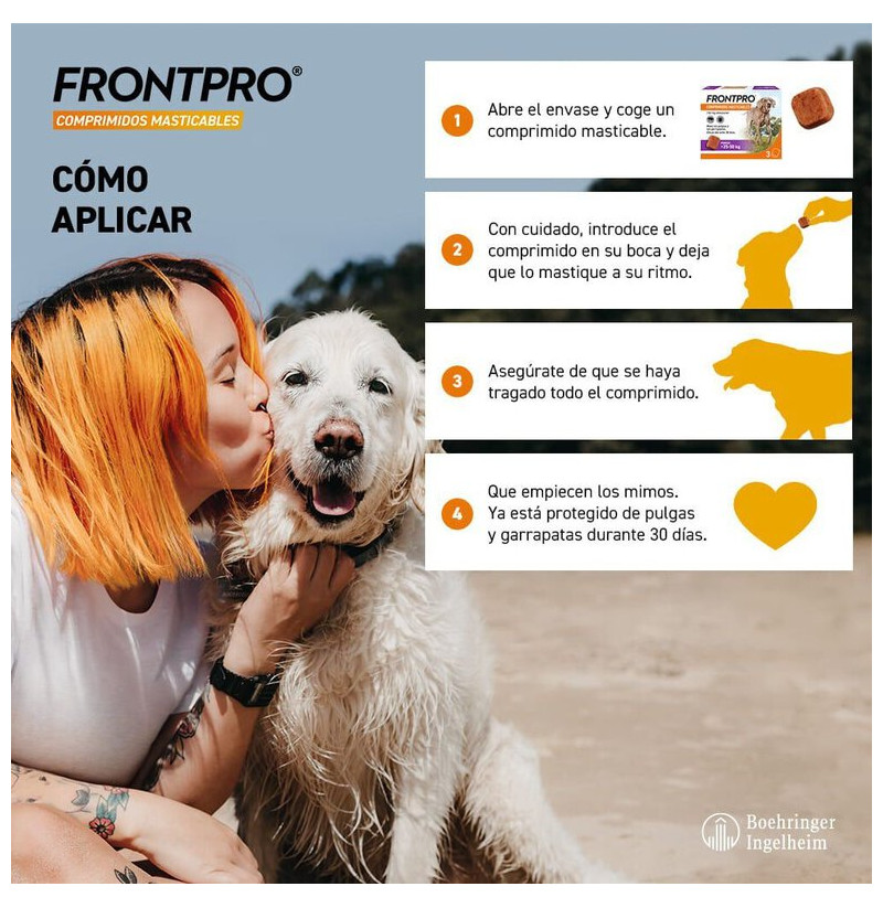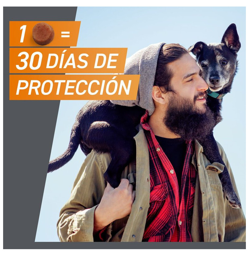 El comprimido es muy apetecible para la mayoría de perros, por lo que suele aceptarse directamente o mezclado con la comida. Se administra UNA vez al mes y es importante ajustar la dosis al peso del animal. Evitar usar en perros menores de 8 semanas o con menos de 2 kg, y consultar al veterinario en caso de gestación o lactancia.