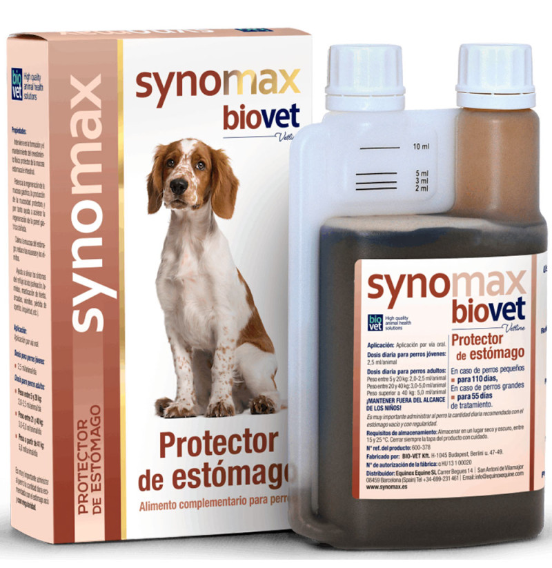 https://tienda.todomascota.es/perros/30053-synomax-jarabe-protector-de-estomago-para-perros-5999885063116.html#/cantidad-275_mlSYNOMAXPROTECTORSynomax Jarabe Protector de Estómago para perros<h2>Protector de Estómago Synomax – Jarabe de Apoyo completo a la salud gástrica de perros</h2> <p>El suplemento líquido <strong>Synomax Protector de Estómago</strong> está formulado para ofrecer una protección integral de la mucosa gástrica e intestinal en perros con sensibilidad digestiva, <strong>reflujo ácido</strong>, <strong>vómitos recurrentes</strong>, <strong>ingestión de hierba</strong> o <strong>úlceras gástricas</strong>. Gracias a su formulación avanzada con <strong>16 ingredientes bioactivos</strong>, este jarabe actúa de forma protectora y regeneradora sobre el sistema digestivo.</p> <h3 style="margin-top: 15px;">¿Cómo ayuda el jarabe Synomax Protector de Estómago al bienestar digestivo del perro?</h3> <p>Synomax Biovet contribuye al correcto equilibrio y funcionamiento del sistema digestivo. Ayuda a <strong>disminuir la irritación del estómago</strong> y a <strong>prevenir alteraciones digestivas</strong> como el reflujo ácido o la aparición de úlceras. Además, favorece las <strong>defensas naturales del organismo</strong> y el bienestar general del perro.</p> <p>Es especialmente recomendable para perros con <strong>digestiones delicadas</strong> o tendencia a <strong>molestias gástricas</strong>. También interviene en la protección y regeneración de la mucosa gástrica e intestinal, estimulando la producción de moco protector que refuerza las <strong>barreras naturales del estómago</strong>. Su acción calmante<strong> alivia el malestar estomacal</strong>, reduciendo episodios de náuseas y vómitos. Del mismo modo, contribuye a mitigar los síntomas del reflujo ácido, tales como <strong>salivación excesiva</strong>, lamido frecuente, ingesta de hierba, <strong>arcadas o falta de apetito</strong>.</p> <h3 style="margin-top: 15px;">Formulación y composición</h3> <ul> <li><strong>Aceite de avena refinado:</strong> crea una capa protectora rica en lípidos polares; posee propiedades antiinflamatorias y es fuente de ácidos grasos esenciales.</li> <li><strong>Pulpa de espino amarillo:</strong> con vitamina C, E y carotenoides, reduce el estrés oxidativo y favorece la regeneración de tejidos inflamados.</li> <li><strong>Extracto de regaliz:</strong> apoya la regeneración de la mucosa gástrica y reduce irritación causada por ácido gástrico.</li> <li><strong>Extracto de manzanilla:</strong> rico en flavonoides y apigenina, con efecto calmante y antiinflamatorio.</li> <li><strong>Extracto de corteza de olmo rojo:</strong> aporta mucílagos que recubren el tracto gastrointestinal formando una película protectora.</li> <li><strong>Quitosano:</strong> polisacárido que captura ciertas toxinas y forma una fina capa sobre la mucosa, disminuyendo la irritación gástrica.</li> <li><strong>Colágeno hidrolizado:</strong> sus péptidos favorecen la elasticidad y regeneración del tejido conectivo digestivo. </li> <li><strong>L-Treonina:</strong> aminoácido esencial para la producción de mucina, clave en la protección de la mucosa gástrica. </li> <li><strong>L-Glutamina:</strong> favorece la regeneración de la mucosa intestinal, mejora la permeabilidad intestinal y reduce la inflamación. </li> <li><strong>Hialuronato de sodio:</strong> retiene agua, hidrata y favorece la reparación de micro-lesiones en la mucosa gástrica e intestinal. </li> <li><strong>Vitamina E:</strong> antioxidante liposoluble que protege las células contra daño oxidativo y apoya la regeneración. </li> <li><strong>Zinc:</strong> forma de alta biodisponibilidad que favorece la cicatrización y regeneración de la mucosa gástrica.</li> <li><strong>Manano-oligosacárido:</strong> favorece el crecimiento de bacterias intestinales beneficiosas e inhibe las nocivas, contribuyendo al bienestar digestivo.</li> <li><strong>Fructo-oligosacárido:</strong> prebiótico que mejora la flora intestinal, la digestión y la función de barrera gástrica. </li> <li><strong>Levadura de cerveza hidrolizada:</strong> apoya el sistema inmune, el metabolismo celular, aporta aminoácidos y favorece la vitalidad general.</li> <li><strong>β-Glucano:</strong> refuerza la capacidad de defensa natural del organismo y favorece una flora intestinal equilibrada. </li> </ul> <h3 style="margin-top: 15px;">Beneficios clave y aplicación</h3> <ul> <li>Genera una <strong>capa protectora</strong> sobre la mucosa gástrica e intestinal, atenuando la irritación y el exceso de ácido. </li> <li>Promueve la <strong>regeneración de la mucosa</strong> dañada o inflamada, mejorando la absorción y la función digestiva. </li> <li>Contribuye al <strong>bienestar digestivo</strong> del perro y refuerza sus defensas naturales. </li> <li>Indicado para perros con sensibilidad digestiva, gastritis, reflujo ácido o como medida preventiva en casos de ingestión de hierba o vomitado frecuente.</li> <li>Puede administrarse de forma continua, al tratarse de un suplemento alimenticio seguro sin efectos secundarios conocidos. </li> </ul> <h3 style="margin-top: 15px;">Dosificación recomendada</h3> <ul> <li><strong>Cachorros:</strong> 2,5 ml al día durante 2-3 meses.</li> <li><strong>Perros adultos:</strong> <ul> <li>5-20 kg: 2,0-2,5 ml al día</li> <li>21-40 kg: 3,0-5,0 ml al día</li> <li>Más de 41 kg: 5,0 ml al día</li> </ul> </li> <li>Puede utilizarse de forma continua sin efectos adversos.}</li> </ul> <h3>Diferenciadores clave de la marca Synomax</h3> <ul> <li>Especialización en productos líquidos de alta absorción, facilitando la administración y aumentando la eficacia.</li> <li>Fabricación premium con materias primas de alta calidad, diseñadas para mascotas con necesidades digestivas exigentes.</li> <li>Producción en la Unión Europea con controles de calidad y trazabilidad rigurosos.</li> <li>Formulación esp