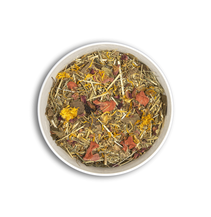 Composición: Heno Timothy, heno de pasto curado al sol, harina de alfalfa deshidratada, productos de forraje, zanahoria deshidratada, ortiga (Urtica Dioica L.), abedul (Betula L.), echinacea (Echinacea), aceite de soja, suplemento vitamínico, sal y carbonato de calcio.
