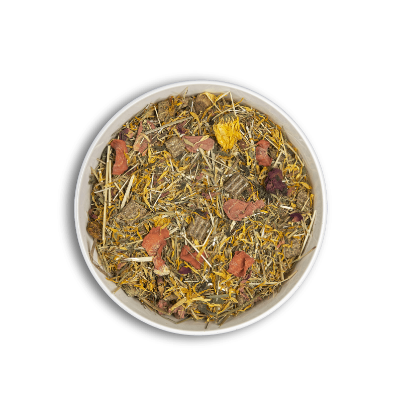 Composición: Heno Timothy, heno de pasto curado al sol, harina de alfalfa deshidratada, productos de forraje, zanahoria deshidratada, copos de guisante enriquecidos con ácido ascórbico estabilizado (fuente de vitamina C), ortiga (Urtica Dioica L.), aceite vegetal, caléndula (Calendula officinalis L.), suplemento vitamínico, carbonato de calcio, sal y fosfato monocálcico.