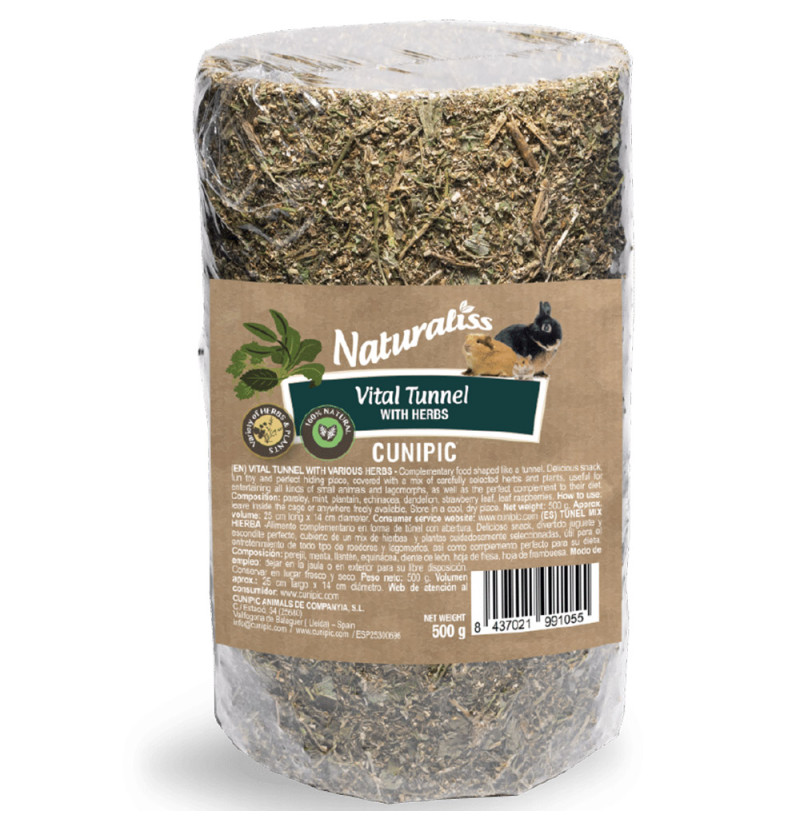 El túnel mix de hierbas de Naturaliss es un alimento en forma de túnel ideal para complementar la dieta de tu pequeño animal. Este delicioso snack está hecho de una cuidadosa selección de hierbas cuidadosamente como perejil, menta, llantén, equinácea o diente de león