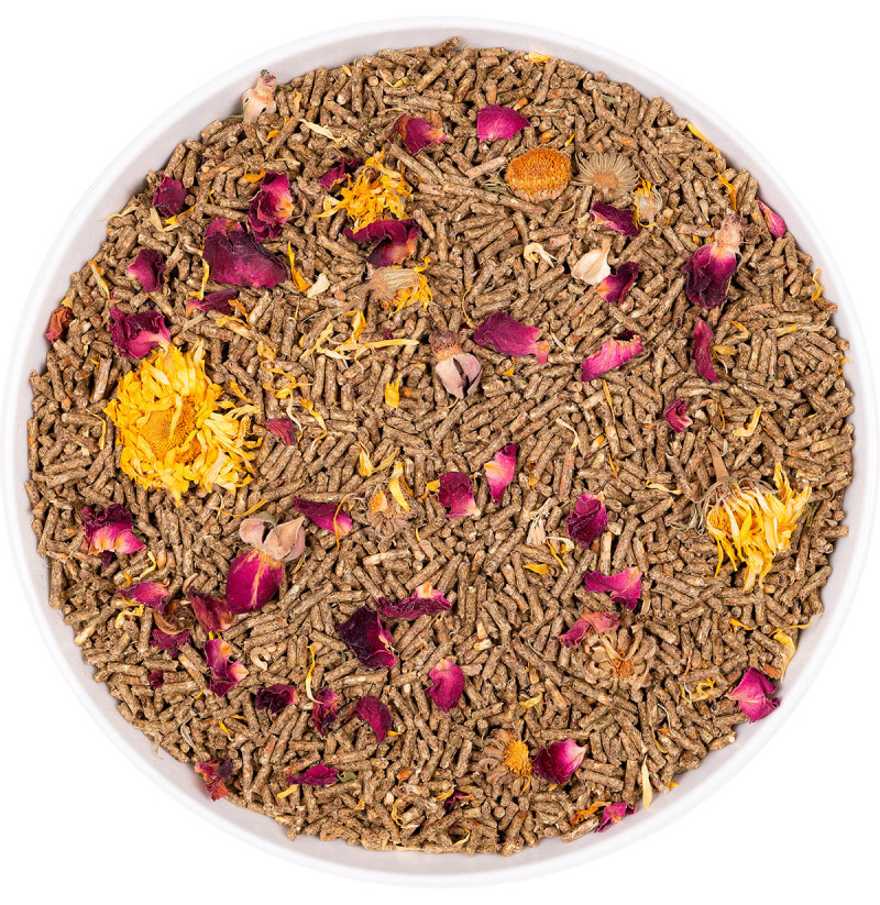 COMPOSICIÓN: Composición: Heno (36 %)(Timothy, festuca, ray grass, alfalfa y heno de la montaña secado al sol, (más de 45 especies que lo componen), semillas de girasol integral, salvado (10 %), soja integral, copos de guisante, vainas de algarroba, pulpa de manzana (4 %), cáscara de soja, melaza de caña, pulpa de remolacha (3 %), habas, zanahoria (2.50 %), caléndula (Calendula officinalis L.), carbonato cálcico, raíz de achicoria, semilla de lino, pétalos de rosa*, sal, levadura de cerveza fuente de manano-oligosacáridos/MOS, 0.12 %%) , orégano, tomillo, canela y cúrcuma.