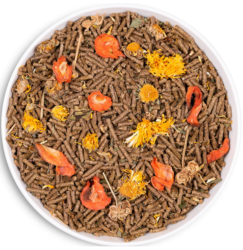 COMPOSICIÓN: Heno (34%), (Timothy, festuca, ray grass, alfalfa y heno de la montaña secado al sol, son algunas de las mas de 45 de especies que componen este heno), semillas de girasol integral, salvado 10%, soja integral, copos de guisantes, pulpa de manzana (5,59%, vainas de algarroba, cáscara de soja, zanahoria (3,50%, melaza de caña, pulpa de remolacha (3%), habas, carbonato cálcico, raíz de achicoria, semilla de lino, menta, equinácea, caléndula, sal, levadura de cerveza, orégano, tomillo, canela y cúrcuma.