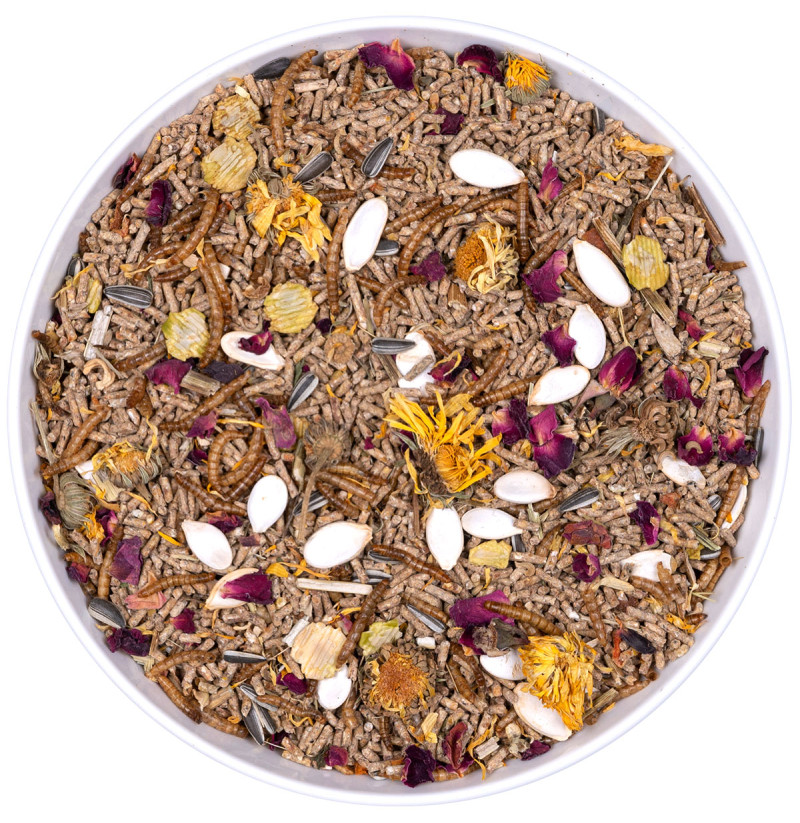 COMPOSICIÓN: Salvado de trigo (20 %), cebada, maíz (11.88 %), trigo*, semillas de girasol integral, soja integral, vainas de algarroba, copos de guisante enriquecidos con vitamina C, avena negra, espelta, avena blanca, zanahoria (2 %), pulpa de remolacha (2 %), carbonato cálcico, larvas de gusano (Tenebrio Molitor, 1.4 %), aceite de soja, equinacea (Echinacea), pipas de girasol iregui, pipas de calabaza, caléndula (Calendula officinalis L.), pétalos de rosa, semilla de lino, fosfato monocálcico, sal, semillas de girasol integral, levadura de cerveza (fuente de manano-oligosacáridos/MOS, 0.12%), orégano, inulina de agave, tomillo, menta, canela y cúrcuma.