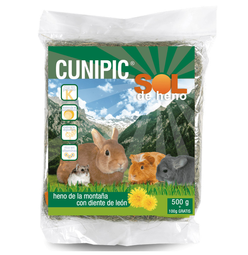 Concretamente, Sol de heno con diente de león Cunipic tiene un alto porcentaje en potasio lo que previene alteraciones cardiovasculares y problemas digestivos, además de contener vitaminas C y A que previenen los posibles problemas dentales (como la caída y la debilidad de encías). Además de todos sus beneficios, Sol de heno con diente de león Cunipic es un producto muy sabroso que agrada a todos los animales que lo prueban por su excelente sabor.