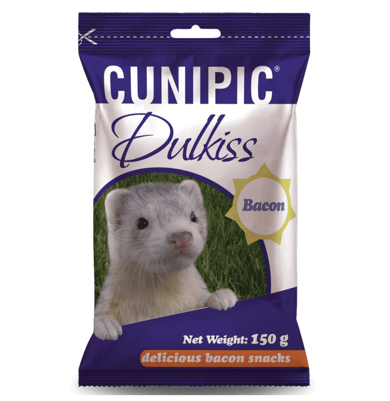 Snack Dulkis de beicon para hurones Cunipic es un alimento complementario útil para el entrenamiento de hurones, así como complemento perfecto en su dieta, especialmente pensado para hurones de cualquier edad y estado fisiológico.